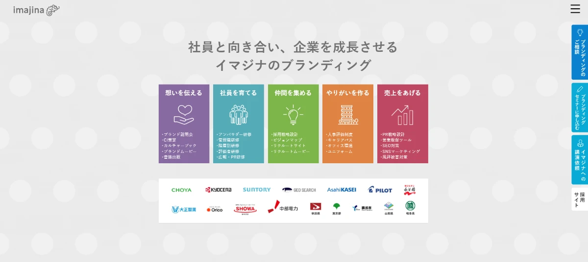 株式会社イマジナは、企業のブランディングを専門とするコンサルティング会社です。 同社は、企業のトップである経営者の意識を変えることで、社員や会社、ひいては社会全体を変えていくことを目指しています。「人材の力でブランドをつくる」という理念のもと、ブランディングを通じて顧客企業の成長を支援しています。