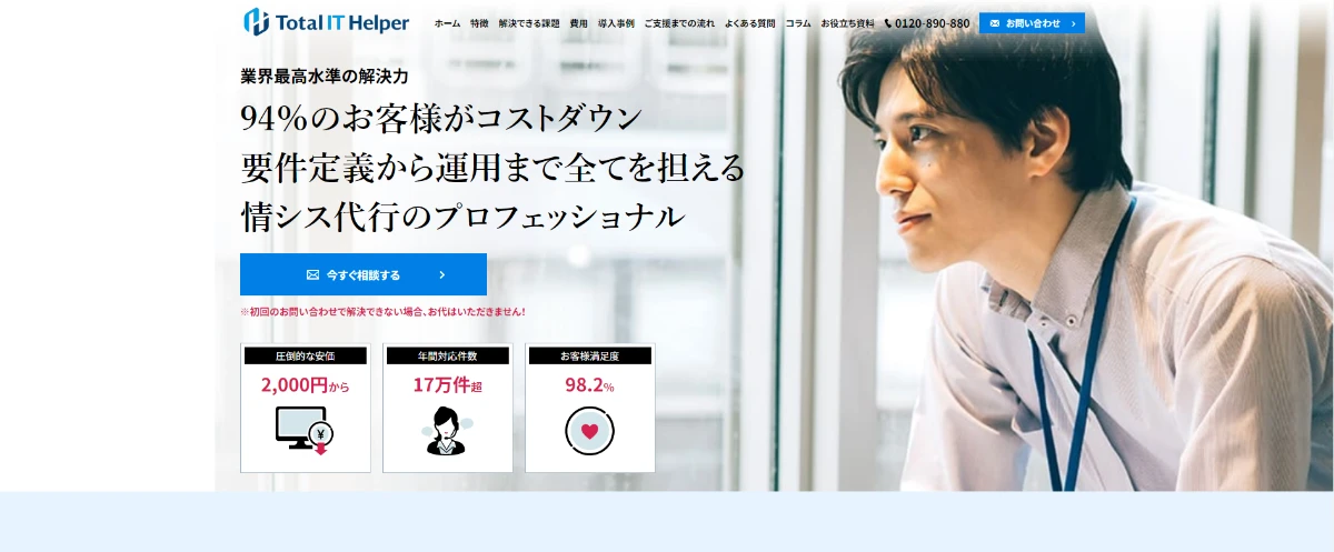 トータルITヘルパーの情シス代行サービスは、企業の情報システム部の業務のサポート、もしくは全てを引き継ぎ・運営を行うサービスです。 お困りごとに対するサポートやコンサルティングから、ヘルプデスク・ネットワーク構築・キッティングなど様々な実務まで対応可能です。高いITスキルを持つ167名のスタッフが貴社の課題解決に尽力し、情報システム部の負荷とコストを軽減させ、アウトソーシングを成功に導きます。