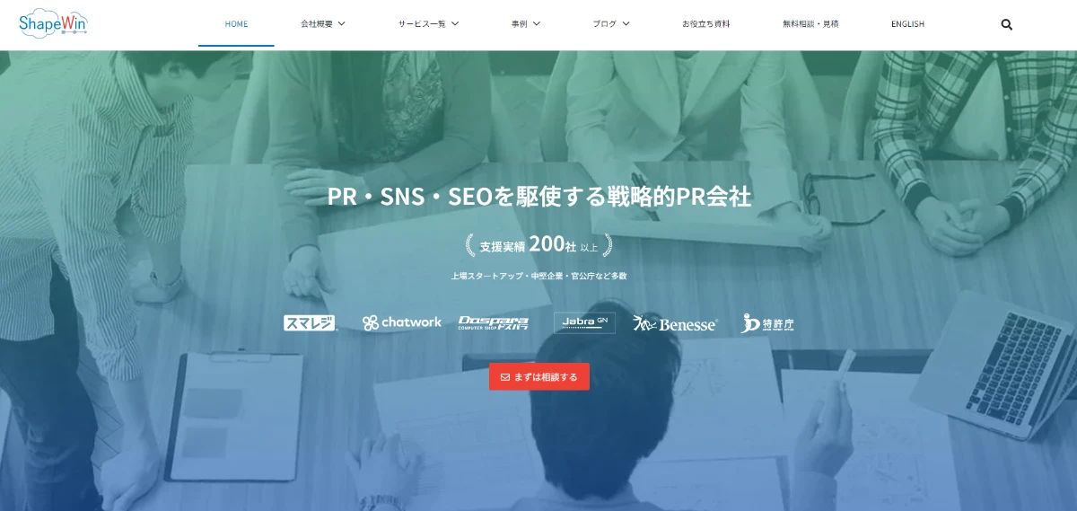 戦略的PR会社のシェイプウィンは200社以上を支援したノウハウを活かし総合マーケティング支援を行います。パブリックリレーションズをベースに、PR・SNS・SEO戦略をお客様ごとに効果的に組み合わせ、戦略から実行までをまるごと引き受けます。