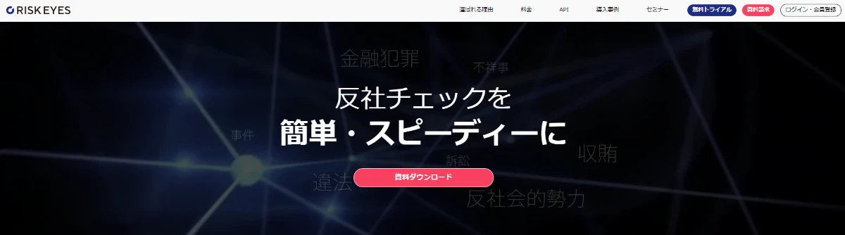 RISK EYESは、取引先の反社会的勢力との関係や不祥事を迅速かつ正確に確認する反社チェックツールです。 ・膨大な新聞・WEB情報から関係ない情報を除外、必要な情報のみを表示するフィルタリング機能 ・既存システムとの「API連携」や「業界唯一の生年期間検索」などの多機能性 ・複数の取引先をリストをアップすることで一括検索が可能 と効率的に運用することが可能です。